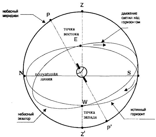 Большой круг небесной сферы, проходящий через полюс мира (РР’), зенит и надир (ZZ’), называется небесным меридианом, который отражается на земной поверхности в виде земного (географического) меридиана. Небесный меридиан делит небесную сферу на восточную и западную и пересекается с истинным горизонтом в двух диаметрально противоположных точках – точке юга (S) и точке севера (N).