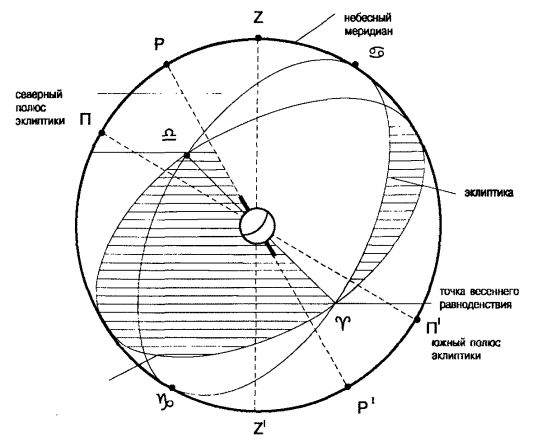 Линия пересечения плоскости эклиптики с плоскостью небесного экватора пересекает поверхность земной сферы в двух диаметрально противоположных точках, называемых точками весеннего и осеннегоравноденствия. Точку весеннего равноденствия принято обозначать (Овен), точку осеннего равноденствия – (Весы). Солнце в этих точках бывает соответственно 21 марта и 23 сентября. В эти дни на Земле день равен ночи. Точки эклиптики, отстоящие от точек равноденствия на 90°, называются точками солнцестояний (22 июля – летнее, 23 декабря – зимнее).