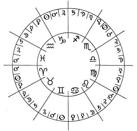 Есть и другие эссенциальные достоинства и слабости, которые мы по мере изучения будем узнавать; такие, например, как нахождение планеты в своём градусе, деканате, терме и др. (см. Приложение 2, Табл. 5, 6, 7; рис. 4.7, 4.8).