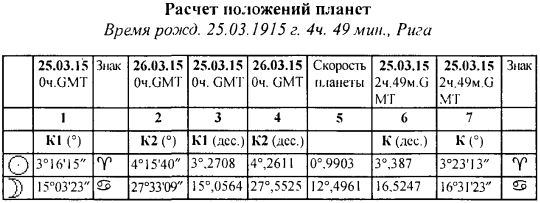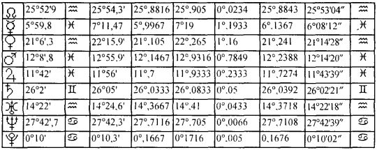 Для расчёта положения планет необходимы эфемериды. В них мы находим дату рождения (по Гринвичу!), выписываем все значения планет на этот день (значения не округлять!) в столбик 1 (см. Табл. 4.2). Далее берём следующую за днём рождения дату и выписываем рядом в столбик 2 значения планет, соответствующие этому дню. Затем последовательно для каждой из планет производим вычисления но нижеприведённой формуле: