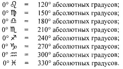 Значения положений планет (для удобства расчётов) лучше перевести в абсолютные градусы. Абсолютные градусы – это градусы, отсчитываемые от 0° Овна.