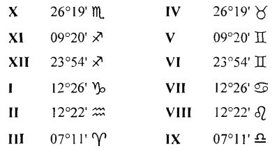 Например, звёздное время рождения 15 ч 37 мин. Взяв таблицы Коха, находим в столбце, соответствующем звёздному времени 15 ч 36 мин – наиболее близком к значению 15 ч 37 мин, и в строке, например, соответствующей широте Риги, т.е. 57°, следующие значения: