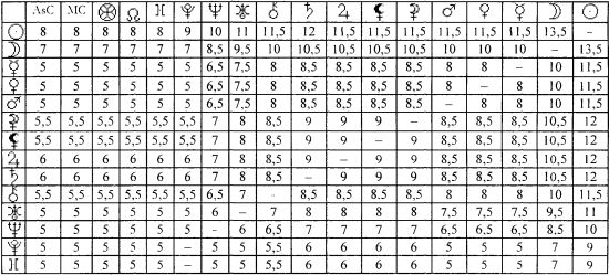 В данной таблице указаны орбы влияния планет для основных аспектов.