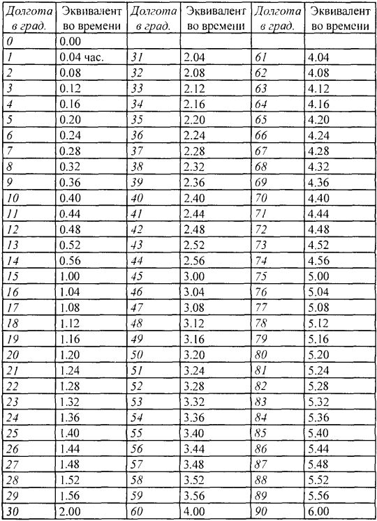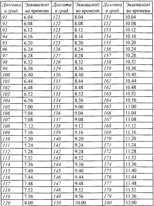 Таблица 14. Перевод долгот (в градусах) в эквивалент во времени (отсчёт от Гринвича)