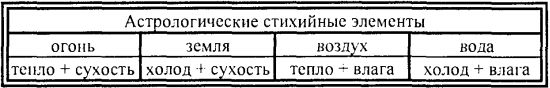 Четыре принципа, объединяясь попарно, образуют четыре стихийных элемента (четыре стихии), которые древние астрологи называли первоэлементами.