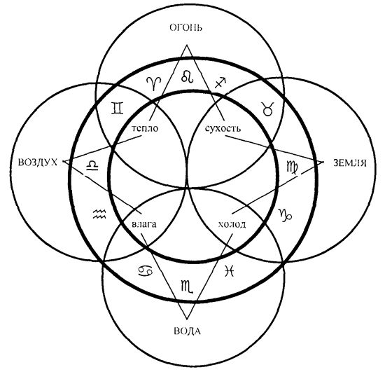 Рис. 1.1. Взаимосвязь астрологических элементов и принципов на зодиакальном круге